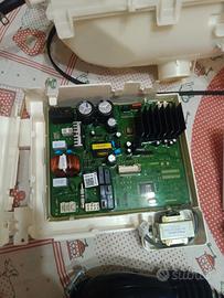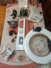 scheda madre, cassetto detersivo completo, oblo'con dispositivo di blocco, mascherina superiore con pulsantiera e display digitale, pompa di scarico, motore, elettro valvola entrata acqua, filtro scarico acqua con coperchio esterno, cinghia, tubi in gomma per pompa acqua come da foto.