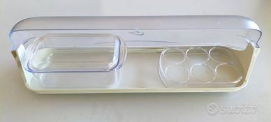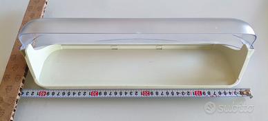Vendo ripiano in plastica con coperchio basculante per porta frigorifero + accessori contenitore porta alimenti + porta uova Il ripiano è compatibile con frigorifero Ariston BCB 312 AAI Misure complessive: Larghezza 44 cm. Profondità 10,5 cm.