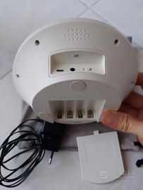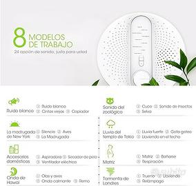 Riproduttore di rumori bianchi che fanno addormentare tranquillamente, adatto per neonati, bambini, adulti. 24 rumori bianchi suddivisi in 8 categorie con 3 differenti rumori: onde del mare, suoni del bosco, pioggia, temporale, phon, fotocopiatrice, rumori di città, etc.