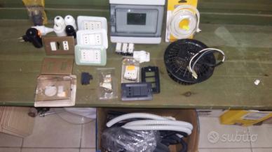 Vendo roba varia presente nelle foto. Diversi modelli di triple, di qui una particolarmente indicata contro il fulmine (vedete altro annuncio a parte) placche con supporti completi e non, interruttori, deviatori, pulsanti di marche Gewis, Ticino, Master e laltri. Spine, portalampade, sportello esterno per quadro elettrico 3 posti, motore per la cappa, due avvitatori come nuovi con batterie da sostituire, due caricatori da 14,4 e 18 volt Matrix e Steel. Incirca 50 mt di cavi elettrici unipolari ; 3×1,5-2,5; 4×1,5 un po di corrugato. Vendesi preferibilmente in blocco a 70 euro, per pezzi singoli prezzi da concordare. Scambio a mano ad Anzio ma possibile anche spedizione al costo del interessato.