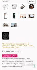 Abantera Robot Aspirapolvere senza fili e ultra leggero dotato di un potente motore da 60W, incorpora WIFI, SMART CONNECT, Intelligenza Artificiale ed è auto-diretto da oltre 60 sensori digitali. Il Robot Aspirapolvere Abantera ha 6 funzioni in 1 che può eseguire anche contemporaneamente: Spazza, Aspira, Lava, Lucida, Disinfetta e Profuma. Vendo per inutilizzo. Prezzo del nuovo 1.500 euro. Vendo a €400 . Completo di ricambi e libretto di istruzioni. Con telecomando e app Tuya da scaricare.
