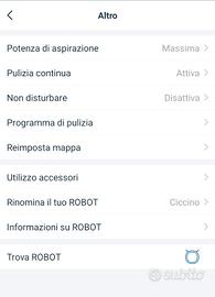 Vendo solo per cambio modello. Può aspirare e basta oppure aspirare e lavare con l'altro accessorio. La carica dura per 2 giri per circa 80 mq. Utilizza il laser LIDAR per evitare ostacoli e fare mappa.