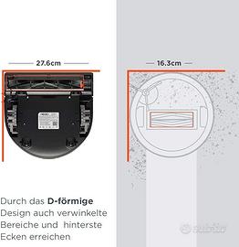 - forma di D con tecnologia Corner Clever che consente di raggiungere anche le zone angolate e gli angoli più lontani a dispetto dei robot con forma circolare