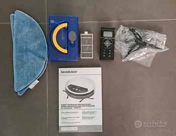 Vendo Robot Aspirapolvere Silver Crest modello SSWR A1 completo di: manuale istruzioni, telecomando, spazzole di ricambio, serbatoio per acqua e 2 panetti per funzione lavaggio pavimenti. Ben tenuto