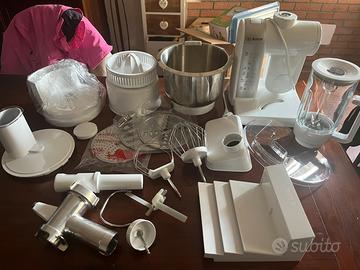 Robot cucina Bosch mai utilizzato conposto da corpo centrale con ventose, multifunzione con planetaria, tritacarne, frullatore, tritatutto , diverse lame per taglio/ grattugia differenti.