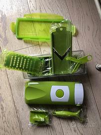 Il Multiuso Mr. Chef è dotato di un affettatore per 4 lame intercambiabili, una vaschetta raccogli verdure, una grattugia, uno stampino, un copri lame, uno sbucciatore doppio uso, un coperchio salva freschezza,