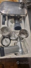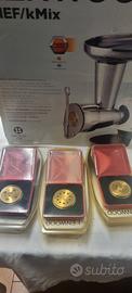 robot da cucina K-mix Con.pleto di tagliaverdure di vario spessore grattugia per formaggio tritacarne con spessore 4 6 8 mm . accessorio per pasta fresca con trafile in bronzo di cui 3 mai usate. ciotola in acciaio con tre tipi di ganci
