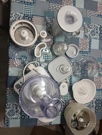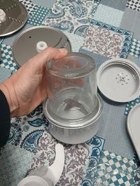 Vendo robot multifunzione Kenwood Multipro con bilancia integrata. Con un unico accessorio puoi tritare, affettare, grattugiare, impastare, macinare caffè, montare panna e albumi e spremere agrumi. Fai tutto con un'unica base, bella da vedersi e compatta. Ha un contenitore dove riporre tutti gli accessori, comodo così rimane tutto a portata di mano. Accessori: - boccale e boccale più piccolo per la metà dose; - bicchiere frullatore capacità 1,5 litri; - spremiagrumi; - 4 dischi in metallo per affettare e grattugiare; - macinino per caffè/formaggio da grattugiare; - piatto per la bilancia da lasciare attaccato alla base e pronto all'uso quando non si usano gli altri accessori; - fruste in metallo Non possiedo più la scatola e le istruzioni (che si trovano comodamente su internet in formato pdf) Preferisco la consegna a mano.