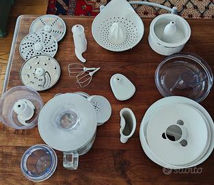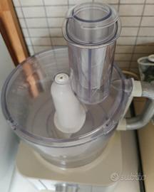 Robot multiuso: impasta, taglia, trita, affetta, grattugia, monta; dotato di spremiagrumi, centrifuga, frullatore. Capienza vaso 1500 ml. Ulteriore vaso da 500 ml. Potenza 1000W. Coperchio e lama da sostituire.