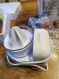 Vendo piccolo robot da cucina perfettamente integro. Formato da accessori per affettare, grattugiare, tritare. Inoltre spremiagrumi e accessorio per preparazione di sorbetti. Praticamente nuovo, usato solo pochissime volte.