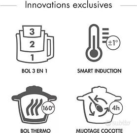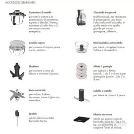 Robot da cucina più performante e unico nella Multifunzione: Cuoce, taglia, amalgama, estrae succhi a freddo, trita, frulla, ha la funzione di cubettatrice e di taglio a spirale per verdure e molto di più alla perfezione. Tutti gli altri piccoli elettrodomestici non vi serviranno più e risparmierete spazio nella vostra cucina, un unico motore 1700W di potenza per tutti gli accessori. Ha una elevata capacità di preparazione 3,5 L + 3,6 L. Cottura grado per grado. Semplice ed intuitivo con programmi automatici, ricette guidate, nella scheda articolo ne potrete vedere alcune, video tutorial e tanto altro. Robot evolutivo completo di accessori. Ricette gratuite, ispirazione e creatività senza limiti, tutti i giorni con il libro di ricette e l’applicazione guidata gratuita. Contenitore metallo per tutte le cotture e le preparazioni di panetteria, esperto o blender. Thermo, mantiene al caldo fino a 2 ore senza consumo energetico. Bacinelle trasparenti multifunzionali, per realizzare le preparazioni una dopo l'altra nella mini bacinella 1,2 litri, in quella media 2,6 litri e in quella grande per tritare, grattugiare, affettare, 3,6 litri. Cestello vapore per cuocere al vapore pesce, carne, verdure 2,5l. Lama per stufare, frullare, impastare, tritare il ghiaccio, mescolare. Coltello per tritare carne o pesce. Sbattitore per montare a neve gli albumi e la panna, per preparare meringhe, mousse, soufflé. Disco Affettatore 2 mm e 4 mm per fettine molto sottili - medio spessore. In acciaio inossidabile. Disco GRATTUGIA 2 mm e 4 mm per grattugiare a grandezza fine - media. In acciaio inossidabile. Applicazione potete trovare tutte le ricette sull'applicazione Magimix disponibile per smartphone e tablet Libro ricette più di 300 ricette adattate al Cook Expert per cucinare tutto, dall'antipasto al dessert. spatola adatta alla forma della bacinella thermo. bilancia da cucina prezzo listino € 1300.00 in offerta € 800.00