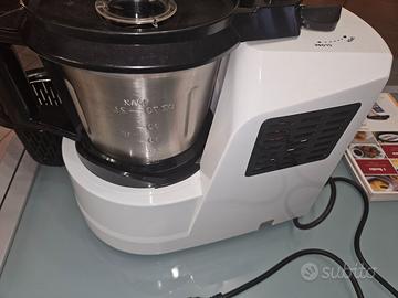 Vendo Robot da Cucina Newchef Mix 7245. Può utilizzare gli stessi programmi del bimby, vedi ricettario a corredo. Utilizzato 3 volte. Trita, impasta, monta, cuoce e frulla. Accessori: cestello per cottura riso e pasta, lame (per impastare e per montare ) coprilame, spatola, farfalla misurino tappo e manuale ricettario. Presenta 2 delle 4 ventose di gomma della base crepate, vedi foto.