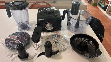 Accessori: impastatrice, tritatutto per carni e verdure, affettatrice e grattugia fine ed intermedia, frullatore da 1,5 lt, spremiagrumi, frusta per montare e mixare impasti morbidi, recipiente da 3,4 litri.
