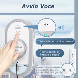 • AlfaBot X8 Automatic Window Cleaning Robot è adatto a superfici lisce e verticali come finestre, porte, pareti, specchi, ecc. Non è consigliato per superfici curve e inclinate. La macchina è adatta anche ai vetri incorniciati e torna a pulire quando raggiunge uno dei bordi.