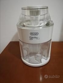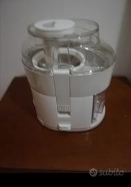Centrifuga elettrica vintage, marca De Longhi prodotta per Mulino Bianco, comoda e compatta, di colore bianco e alcune componenti in plastica trasparente. Cavo ripiegabile da riporre sul retro nell'apposito spazio. Completa di spazzolino per la pulizia del filtro. Con confezione originale, libretto d'istruzioni e ricettario.