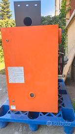 Robur M35 usato ma perfettamente funzionante, include staffe a muro per il fissaggio, di seguito descrizione dettagliata : Panoramica Termoconvettore industriale Robur M CE 35 Metano – ARANCIO 37,4 kW Specifiche Tecniche Gas di alimentazione : Metano Potenza Termica (kW) : 30.7 Peso (kg) : 68 Attacco M 1/2'' Dimensioni ALTxLARxPRO (cm) 80x77x62.4 Tensione di Alimentazione (V) 230 Caratteristiche principali Il generatore d’aria calda serie M e un apparecchio di riscaldamento indipendente del tipo a circuito stagno e tiraggio forzato. Il funzionamento del generatore e comandato da un termostato ambiente, (non fornito a corredo); azionando il termostato la centralina elettronica provvede all’accensione del bruciatore principale. Una sonda a ionizzazione controlla l’avvenuta accensione. I prodotti della combustione attraversano internamente gli scambiatori di calore che sono investiti esternamente dalla corrente d’aria prodotta dal ventilatore elicoidale dando luogo alla immissione di aria calda nell’ambiente. La direzione del flusso d’aria e regolabile verticalmente mediante le alette della griglia mobile. Il ventilatore elicoidale si aziona automaticamente solo quando riceve il consenso dal termostato di comando ventilazione, cioe a scambiatori caldi, in modo da evitare l’immissione di aria fredda nell’ambiente, e si spegnera a scambiatori freddi. Nel caso di surriscaldamento degli scambiatori di calore, dovuto a funzionamento anomalo, e previsto un termostato di limite che interviene togliendo alimentazione alla valvola gas, la quale a sua volta interrompe il flusso del combustibile facendo spegnere il bruciatore principale. Elenco Caratteristiche Soluzione “a moduli” e su misura per ogni esigenza * Ogni generatore e indipendente e autonomo per riscaldare solo dove e quando serve. * Sono ideali in vista di modifiche, spostamenti o ampliamenti dell’impianto. * Permettono un proficuo utilizzo delle aree interne grazie all’installazione pensile.