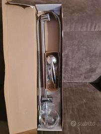 Il prodotto è un Hansgrohe Croma Variojet Set, un kit doccia completo di alta qualità prodotto dal noto marchio tedesco. Dalle specifiche riportate sulla confezione, il set include: Doccetta (Handbrause): Dotata di 2 diverse modalità di getto. Asta doccia (Unica 'S): Lunghezza di 0,65 metri (65 cm). Flessibile doccia: Lunghezza di 1,60 metri. Accessori: È incluso un portasapone della serie "Cassetta 'S".