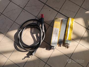saldatrice ben funzionante su carrellino a ruote, più seconda pinza nuova, e 3 scatole di elettrodi.