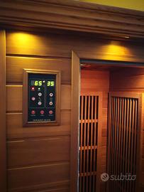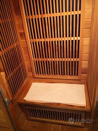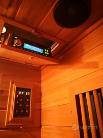 Sauna ad infrarossi 2 posti con irradiatori in carbonio, temperatura massima di esercizio 65° C, compresa di cromoterapia, ionizzatore, illuminazione interna, pannello di controllo interno con display LCD, radio, mp3, due altoparlanti, ventilazione portello, timer regolabile fino ai 90 minuti con possibilità di esclusione in modo tale da tenere accesa la sauna fino a 4 ore continue.