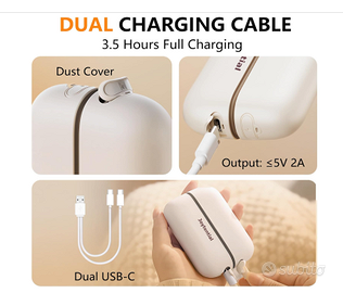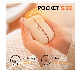Vendo Scalda mani Ricaricabile 2 pezzi . Portatile e magnetico 3 livelli di calore per sci , outdoor , lavoro etc. Nuovo con scatola e accessori. Gli scalda mani sono 2 di colore bianco si ricaricano tramite batteria interna con cavo usbc . La batteria integrata per ognuno è di 5000mah permette un utilizzo fino a 8 ore continuative . Compatti e portatili si adattano a tutte le situazioni, chi soffre di freddo alle mani , alle giornate lavorative fuori , per chi va sciare o chi fa sport all'aperto durante l'inverno. 3 livelli di calore e dei pratici magnieti per attcarali in vari posti . Una volta acceso in circa 3 secondi va in temperatura, comodo anche da tenere in tasca della giacca . Con forma stondata comoda da tenere in mano. Tasto di accensione e spegnimento piu 3 led che indicano lo stato della batteria . Si ricaricano con il comodo cavo in dotazione che ha doppia uscita usbc in circa 1 ora , questo a dove vengono collegate per essere ricaricate. Perfetto per outdoor , passeggiate con i cani nei periodi invernali , in ufficio , a pesca , in campeggio , o chi lavora fuori al periodo invernale.