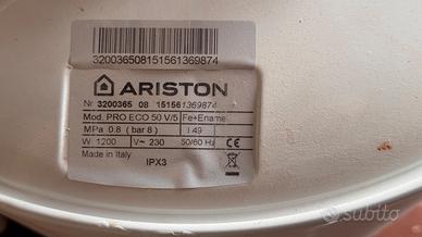 Vendo scaldabagno scalda acqua elettrico Ariston PRO ECO 50 V/5 da 50 litri, potenza 1200W. Classe energetica: B.
