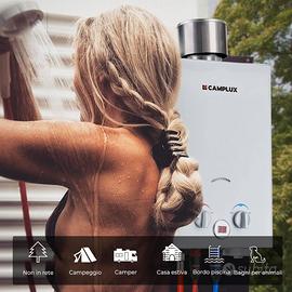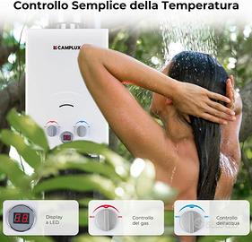 Camplux BW158C - Scaldabagno istantaneo a gas, con copertura antipioggia, Tankless LPG, 6 l, 12 kW, 50 mbar, per campeggio, doccia di cavalli [Classe di efficienza energetica A+]Acqua calda istantanea da 6 l/min - Con una pressione dell'acqua di 0,25 bar all'avvio e accesa da batterie a celle 2D, è ideale per campeggi, camper, stalle, carrelli e altre aree fuori dalla griglia. ➤ Configurazioni di protezione multiple - Protezione da guasto alla fiamma, protezione da surriscaldamento, protezione da combustione a secco che migliorano la sicurezza della tua famiglia.