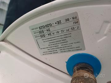 Boiler a muro Ariston modello 80V FFI-E, potenza 6.4, capacità di accumulo 77 L, classe energetica ACS A, 52 cm lunghezza, 49.5 cm larghezza, 85.9cm altezza.