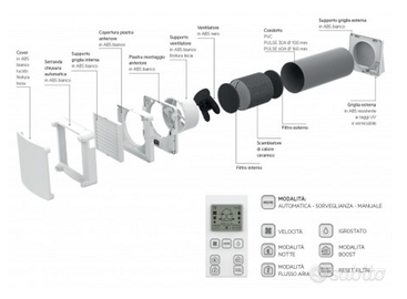 Dettagli prodotto Ventilatore Irsap PULSE 30, ideale per ambienti Fino a 20 mq, Monofase, 13 dBA pressione sonora , 230 V tensione a 50 Hz, 60 m3/h portata aria, efficienza recupero di calore 90%, 8.9 W potenza assorbita, classe energetica A, controllo remoto Si, telecomando, 56.3 cm lunghezza, 21.5 cm larghezza, 21.5 cm altezza - UREP006A0S000 CARATTERISTICHE L’unità di ventilazione è composta da: un elemento interno con griglia frontale in ABS di colore bianco, un ventilatore, un tubo di attraversamento muro lungo 40 cm (il tubo può essere accorciato ad un minimo di 25 cm) che alloggia internamente lo scambiatore di calore in materiale ceramico e filtri antinsetto, un elemento esterno con griglia e cuffia di protezione antipioggia e un telecomando per controllo a distanza. L’unità ha grado di protezione IPX4 e va installata in luoghi chiusi. Le temperature di esercizio sono comprese tra -20 °C e 50°C con umidità relativa massima 80%. FUNZIONAMENTO Lo scambiatore ceramico accumula calore durante l’estrazione dell’aria viziata, ovvero quando il ventilatore aspira l’aria interna del locale. Il calore è ceduto all’aria esterna che viene immessa nel locale, quando il ventilatore, invertendo la rotazione, aspira l’aria di rinnovo. L’unità alterna cicli di immissioni e cicli di estrazione, in modo da garantire il ricambio d’aria. L’aria immessa o estratta dall’unità non deve contenere miscele infiammabili o esplosive, vapori chimici, polveri, oli e sostanze patogene in genere. REGOLAZIONE L’unità è dotata di interruttore ON/OFF a bordo. Sono previste 3 velocità di funzionamento selezionabili da telecomando ed è possibile impostare il funzionamento in modalità automatica. Da telecomando è possibile variare la soglia di intervento dell’igrostato. Superato il valore di umidità relativa impostato, l’unità estrae aria in continuo alla massima velocità, fino a che l’umidità rilevata ritorna sotto il valore impostato, scelto tra tre valori di umidità fissati a 40%, 55%, 70% (il