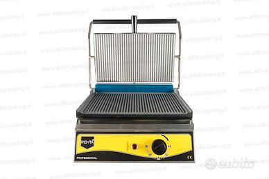 Piastra per panini braccio unico con piastra rigata o liscia in ghisa. Struttura in acciaio inox e maniglia di plastica resistente al calore. Termostato con controllo automatico. Disponibili varie dimensioni.