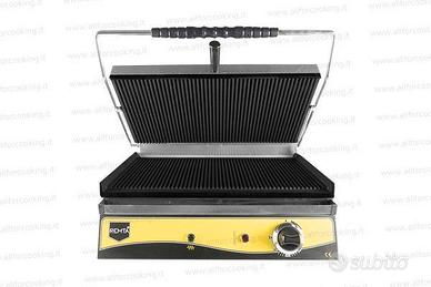 Piastra per panini braccio unico con piastra rigata o liscia in ghisa. Struttura in acciaio inox e maniglia di plastica resistente al calore. Termostato con controllo automatico. Disponibili varie dimensioni.