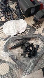Scopa a vapore Necchi NV229 multifunzioni 10 in 1, in vendita perché la persona per cui è stata acquistata due mesi fa l'ha provata una sola volta ed essendo di una certa età e molto tradizionale non se l'è sentita più di usarla. Quindi è stata usata solo una volta per fargliela provare, ammette che sia molto utile ma non la usa. Subito concede di mettere solo 6 foto ma io ne ho tante altre per far vedere tutti i pezzi e i particolari, naturalmente è stata usata solo una pezzetta, l'altra è nuova e sono lavabili anche in lavatrice.