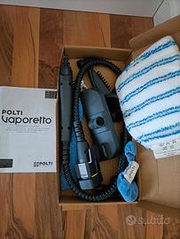 Completa di scatola e garanzia. Acquistata l'anno scorso e usata pochissimo poiché successivamente abbiamo avuto in regalo il robot aspira e lavapavimenti.