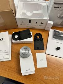 Vendo Nuki Smart Lock PRO 3.0 in perfette condizioni di colore bianco, Con Funzione WIFI e Bluetooth, compatibile con Apple HomeKit, Google Home e e Amazon Alexa, condizioni pari al nuovo, completa di scatola originale, manuale, tutti gli accessori originali e batteria ricaricabile inclusa, oltre ad adattatore per Pomolo Cisa, Abus, ecc.