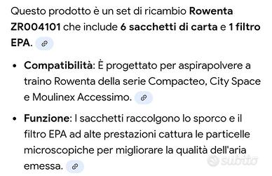 set di ricambio ROWENTA. include 6 sacchetti di carta e 1 filtro epa