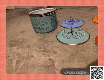Le pentole sono tutte con motivi egizi all'esterno e interni bianchi -- disegnate da Carla Agnelli negli anni 70.