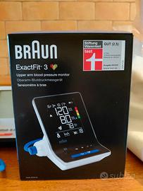 Misuratore di pressione arteriosa Braun Exactfit 3 in perfette condizioni. Con 2 bracciali di misure differenti. Memoria fino a 40 misurazioni. Rilevamento di battito irregolare. Media delle ultime 3 misurazioni. Nella confezione originale. Batterie escluse.