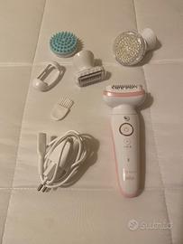 il kit si compone di: Epilatore Silk épil 9, accessorio massaggiante, spazzola esfoliante per il corpo, testina radente, cappuccio di massima aderenza alla pelle, cappuccio di protezione, cappuccio regolatore, spazzolina di pulizia, custodia, alimentatore.