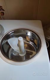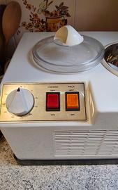 Prodotto usato, ma testato e funzionante. Completo dei ricettari. Caratteristiche tecniche: Peso 15 kg Profondità 30 cm. Larghezza 38 cm. Altezza 22 cm. Motore 220 v Potenza 180 w È possibile produrre fino ad un massimo di 8 etti di gelato, ma è consigliato restare nei 5/6 etti. La macchina è in buone condizioni, la scatola esterna ed il polistirolo invece accusano il tempo. Il cavo elettrico era rimasto attaccato al polistirolo, ma è solo un problema estetico che non ne compromette il funzionamento.
