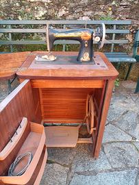Vendo come da foto antica macchina da cucire SINGER con mobiletto trasmissione da ripristinare.
