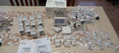 Evohome Honeywell è un sistema di termoregolazione a zone wifi programmabile. Il kit comprende un pannello touchscreen a colori Evotouch Wi-Fi (fino 12 zone), 12 testine termostatiche wireless HR92, modulo relè wireless OPENTHERM per comando modulare della caldaia, inoltre 12 meccanismi di ricambio per aggancio al termosifone, 12 adattatori a vite, 12 riduzioni, 12 supporti per alzare il display delle testine e manuali d'uso del sistema.