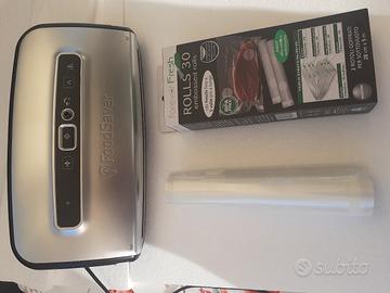 Sistema per la conservazione dei cibi sottovuoto FoodSaver, modello FFS016/X, completo di accessorio, un rotolo per creare i sacchetti e confezione di sacchetti campione. Utilizzato pochissimo, con confezione originale integra e istruzioni. Ideale per la conservazione sottovuoto in dispensa, frigo e congelatore di cibi. Cedo per doppione. Disponibile per la consegna diretta a domicilio o a metà strada se ragionevolmente vicino.
