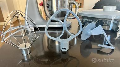 Vendo causa inutilizzo SMEG SMF02BLEU IMPASTATRICE PLANETARIA, 800 W, capacità ciotola 4,8 l, Nero (ISTRUZIONI INCLUSE) Livelli di potenza 10 Accessori Inclusi di base: - ciotola - scudo versatore - frusta a filo / piatta / gancio per impastare Accessori extra inclusi: - tritaverdure con 4 cilindri (per grattugiare e affettare) taglio medio, taglio fine, grattugia grossa, grattugia media - tritatutto con corpo, ghiera e coclea. Incluse 3 trafile a dischi in acciaio inox per macinare o sminuzzare (MAI UTILIZZATO): • Macinatura grossa Ø 8,0 mm • Macinatura media Ø 4,2 mm • Macinatura fine Ø 3,0 mm Accessori per Salsiccia e per Kebbe in plastica Accessorio in silicone per la pulizia delle trafile a disco media e fine, pestello per facilitare l'introduzione degli ingredienti. Tutto in ottime condizioni come nuovo, impastatrice utilizzata soltanto 2 volte.