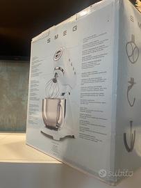 Smeg nuova, mai utilizzata Colore azzurro Estetica 50’s Style Prestazione ed eleganza descrivono al meglio l'impastatrice dal design anni '50, strumento funzionale che aggiunge raffinatezza e stile in cucina Dieci livelli di velocità per adattarsi al meglio alle diverse consistenze di impasto assicurando risultati sempre eccellenti Sistema di avvio graduale "Smooth Start" per la massima efficienza di amalgamazione degli ingredienti e riduzione degli schizzi Motore potente e movimento rotatorio planetario a garanzia di una perfetta miscelazione degli ingredienti Ottima versatilità grazie ai quattro accessori inclusi frusta a filo, frusta piatta, frusta con bordi flessibili e gancio impastatore Dalla gelatiera al set pasta, un'ampia gamma di accessori opzionali disponibili separatamente