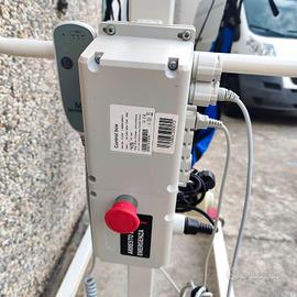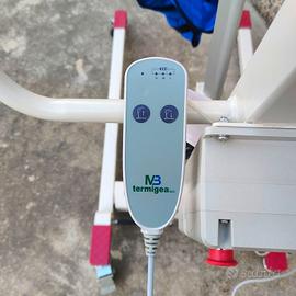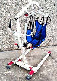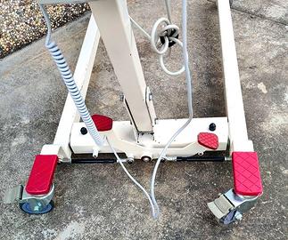Solleva malati elettrico per assistenza domiciliare struttura in acciaio verniciato bianco con base regolabile in larghezza mediante pedale.
