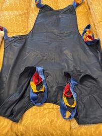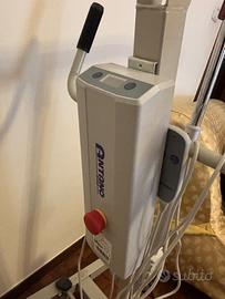 Sollevatore elettrico Antano Group modello Ulisse 150. Con una portata di 150 kg, presenta una solida struttura in acciaio. La base regolabile tramite pedale assicura versatilità, supportata da quattro ruote piroettanti, due delle quali con freno. Il sollevamento è gestito da un attuatore elettrico, controllato da una centralina e alimentato da batterie al piombo, con opzione di movimentazione manuale per emergenze. INCLUSA IMBRACATURA. Spedizione a carico dell'acquirente
