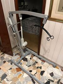 Sollevatore elettrico per persone. Possibilità di utilizzo collegato alla rete o con batteria ricaricabile in dotazione. Compreso di supporto per persone in robusta tela e diversi agganci.