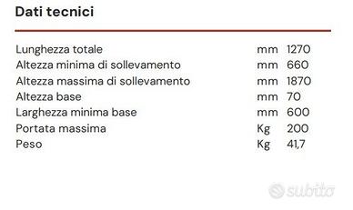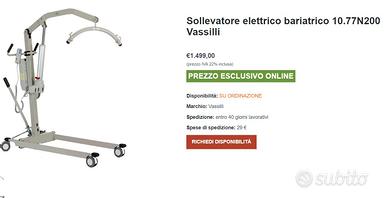 Sollevatore a batteria VASSILLI 10.77N200, uno dei migliori in commercio, versione con portata di 200 KG (e non 150 kg) e costo del nuovo di oltre 1400 euro. L'esemplare in vendita è stato solo acquistato circa tre mesi fa e MAI MAI utilizzato, pertanto è assolutamente NUOVO. Modello con attuatore elettrico provvisto di sblocco meccanico per la discesa di emergenza, sviluppato per avere la massima resa con il minor consumo di energia. Pulsantiera di comando piu’ telecomando. Pulsante di emergenza, segnalatore acustico di batteria scarica, indicatore visivo di guasto, sovraccarico e sovra funzionamento, display con lo stato di carica delle batterie. Carica batterie automatico interno al sollevatore. Base con gambe divaricabili a mezzo leva per permettere l’accesso frontale per il trasferimento da carrozzina, da poltrona, wc ecc. Escursione utile di sollevamento da terra fino a 121 cm. Le ruote posteriori con freno a piede permettono il passaggio sotto ai letti e alle basi. Telaio riducibile per facilitare il trasporto e lo stoccaggio. Autonomia: circa 40 cicli completi. Esemplare NUOVO e assolutamente mai utilizzato si vende quasi a metà prezzo, a soli 800 euro. Altre informazioni facilmente reperibili in rete. SCHEDA TECNICA Lunghezza totale mm 1270 Altezza minima di sollevamento mm 660 Altezza massima di sollevamento mm 1870 Altezza base mm 70 Larghezza minima base mm 600 Portata massima Kg 200 Peso Kg 41,7