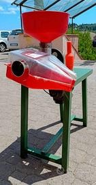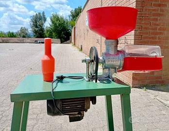 Passapomodori con banco in acciaio verniciato, motore con potenza 0,5 Hp. Completo di filtro,gocciolatoio in poliproprilene per alimenti e imbuto in polipropilene.