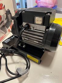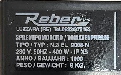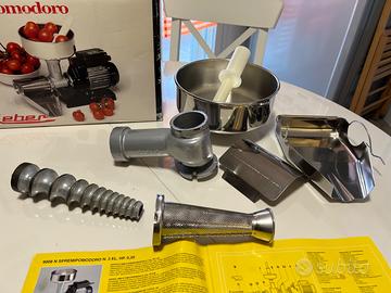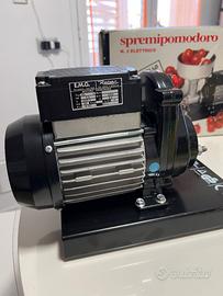 Motore asincrono monofase a servizio continuo HP. 0.30, calotta copriventola, scatola interruttore/condensatore e ventola di raffreddamento costruite in materiale plastico termoestinguente, motorizzazione IP 55 a tenuta stagna; riduttore assiale a bagno d'olio con ingranaggio portante in metallo, serie ingranaggeria in nylon insertato su boccola autolubrificante in bronzo. Corpo ed elica spremipomodoro costruiti in ghisa testata per alimenti e trattata con vernice epossidica alimentare cotta in forno a 300°, perno di traino in nylon; cono filtro, imbuto e sgocciolatoio sono interamente costruiti in acciaio inox 18/10.
