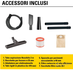 Accessori inclusi: 1 tubo di aspirazione flessibile e resistente alla torsione lungo 2 m; 2 tubi di aspirazione in plastica lunghi 47 cm; 1 spazzola per pavimenti per solidi e liquidi; 1 bocchetta per fessure